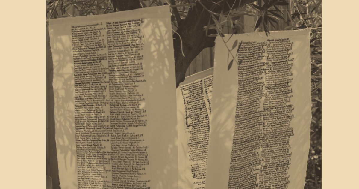 Cette œuvre, « Stitch their names together« , à l’initiative de l’Irlandaise Mary Evers, n’a encore jamais été présentée en France. Elle rend hommage à l’humanité et aux Palestiniens qui ont perdu la vie à Gaza, pour qu’ils ne soient pas que des nombres et au contraire honorer le souvenir et reconnaître l’humanité de chaque victime de ce conflit. L’exposition se compose de lignes brodées avec le prénom de la victime, celui de son père, de son grand-père, et son âge, avec des fils aux couleurs du drapeau palestinien. L’une des forces de cette œuvre est qu’elle est collective et internationale : les brodeuses qui ont participé viennent de tous les endroits du monde.